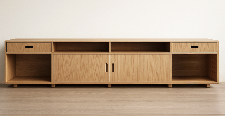 With two drawers and two shelves, the design also incorporates two Japanese inspired sliding doors that reveal or hide two of four lower cabinets. The middle compartment is vented and the back is designed for cables to connect to the wall.