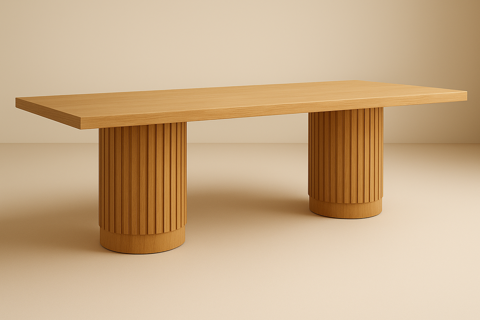 Inspired by Greco Roman architecture and sculpture, the 96″ Opus Domi Dining Table makes a refined statement piece with its substantial rectangular top and two cylindrical pedestal bases clad in vertical oak fluting. Each pedestal features a smooth reveal 3″ inches above the floor, creating a light, floating effect while maintaining stability. Perfect for seating eight to ten guests, this table balances architectural lines with organic materiality.